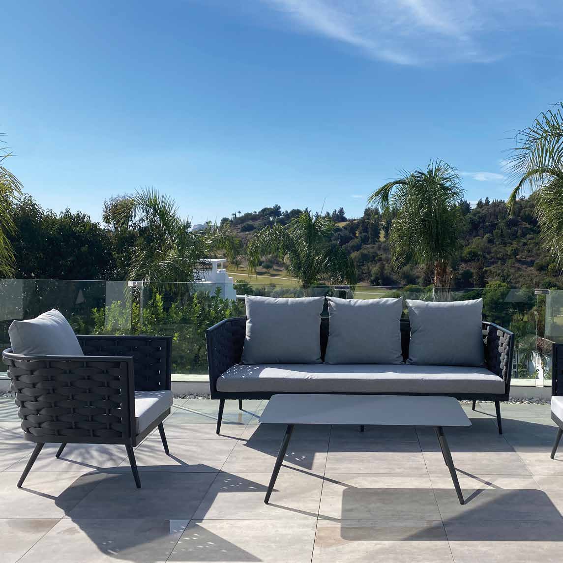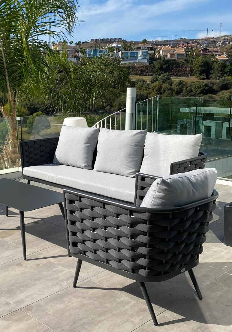 Anthracite aluminum 100% exterior rope in anthracite color.Gray cushions, Aluminum table. Composed of a 3-seater sofa, 2...