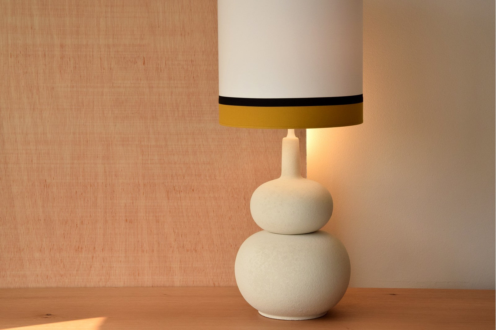 Bedside lamp made of ceramic paste with a slightly rough natural finish evoking a stone texture.