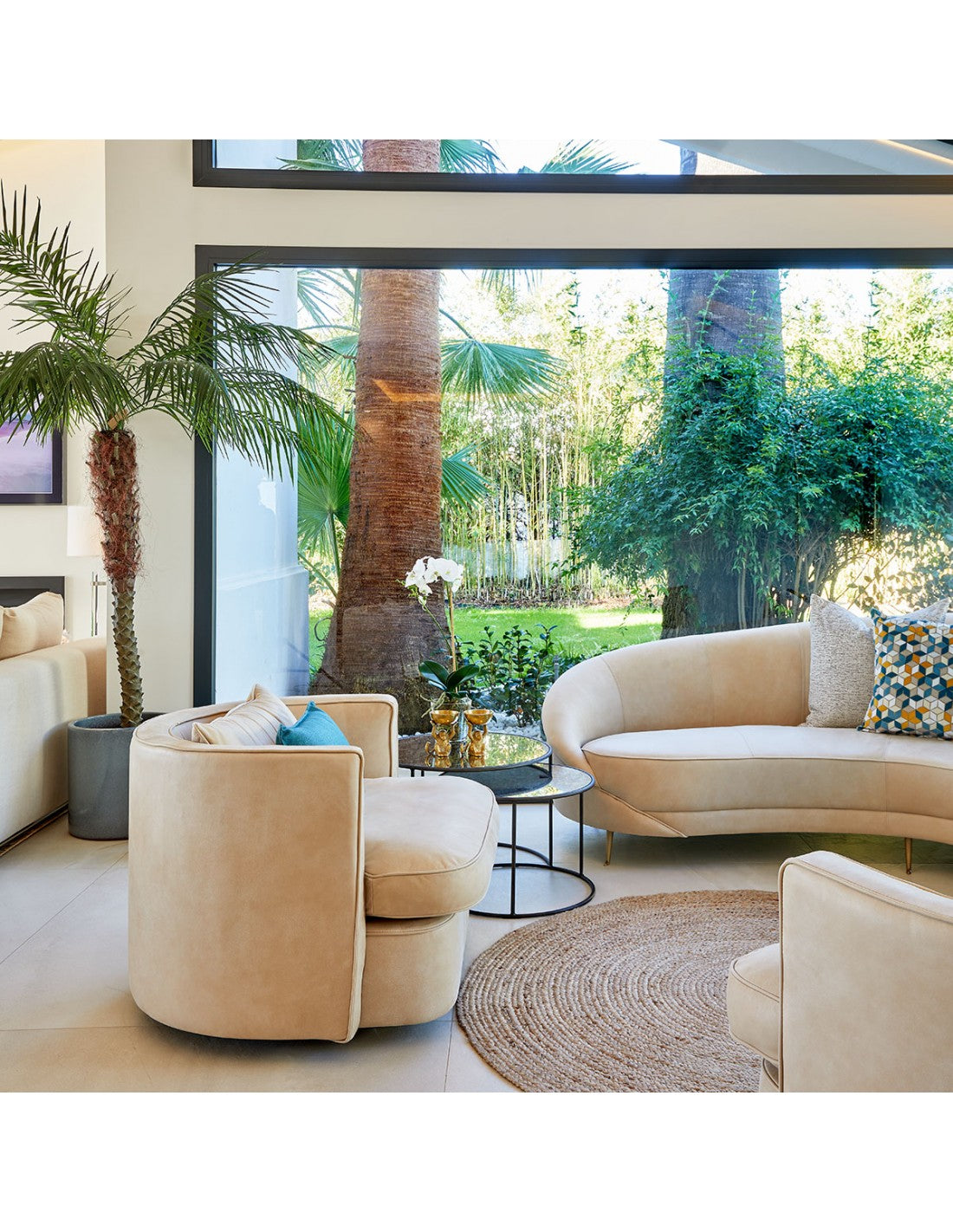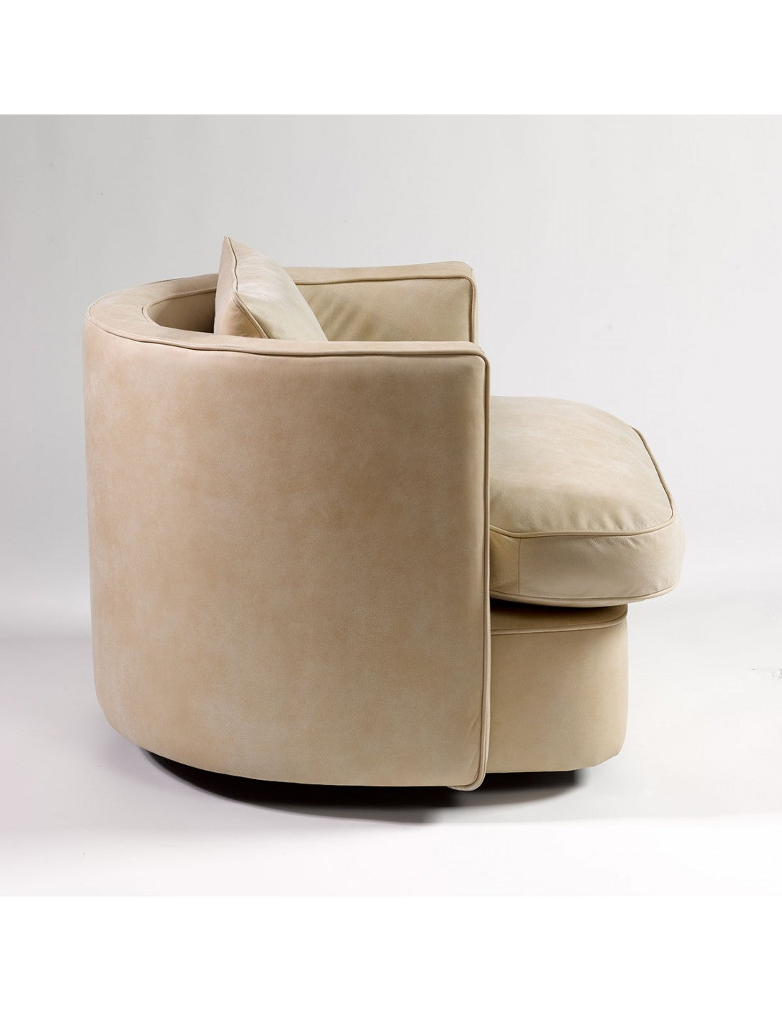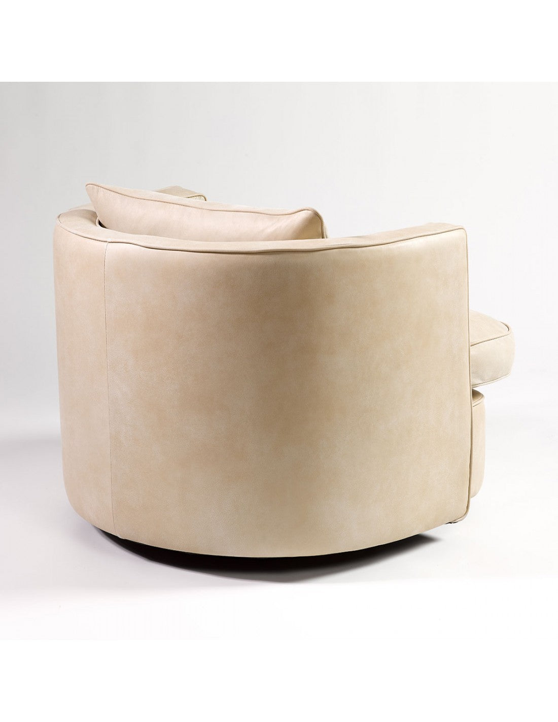 Off-white, leather armchair w/ semicircular backrest, black metal structure, soft cushions upholstered in leather. Elegant and stylish,...