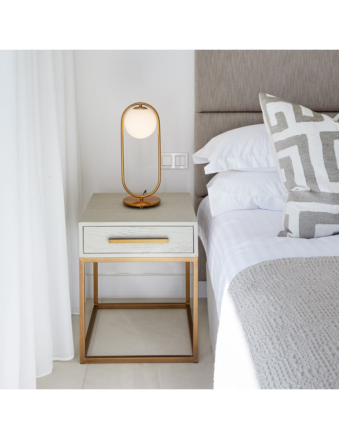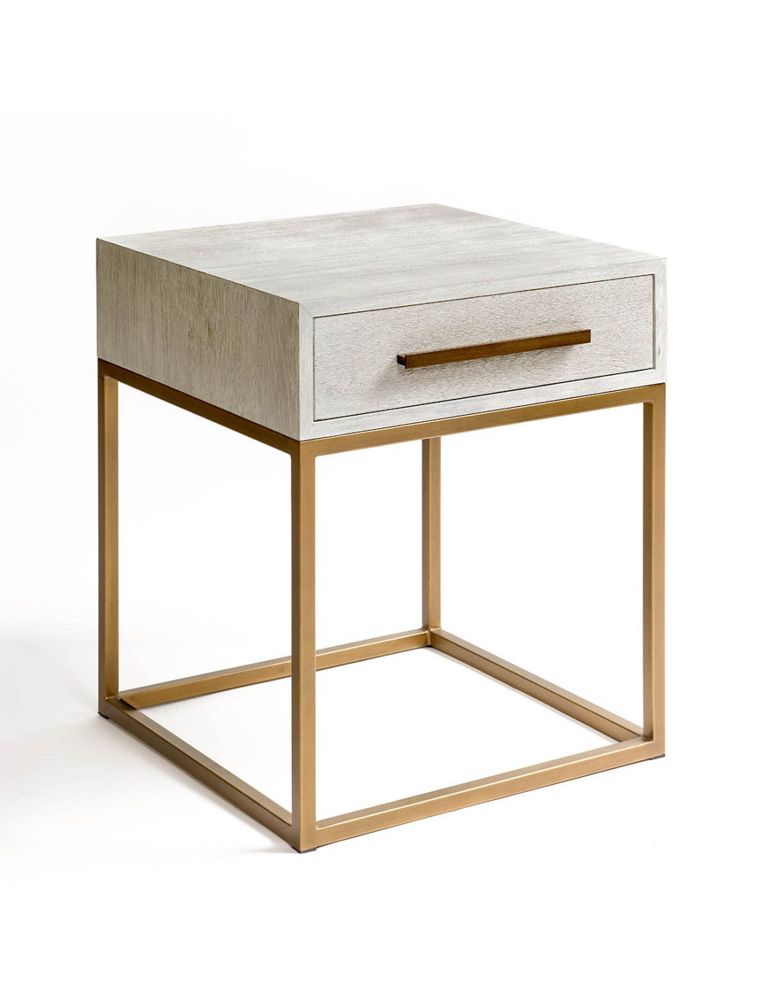 Patina white oak bedside table with aged gold metallic structure. Bedside table with drawer. Piece with straight...
