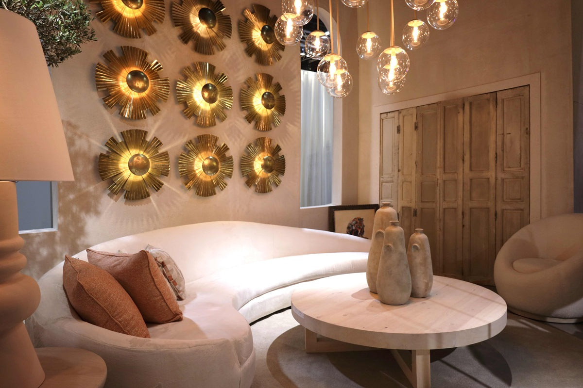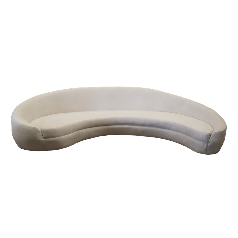 This sofa features a distinctive curved shape and is upholstered in a pristine white fabric. Its generous...