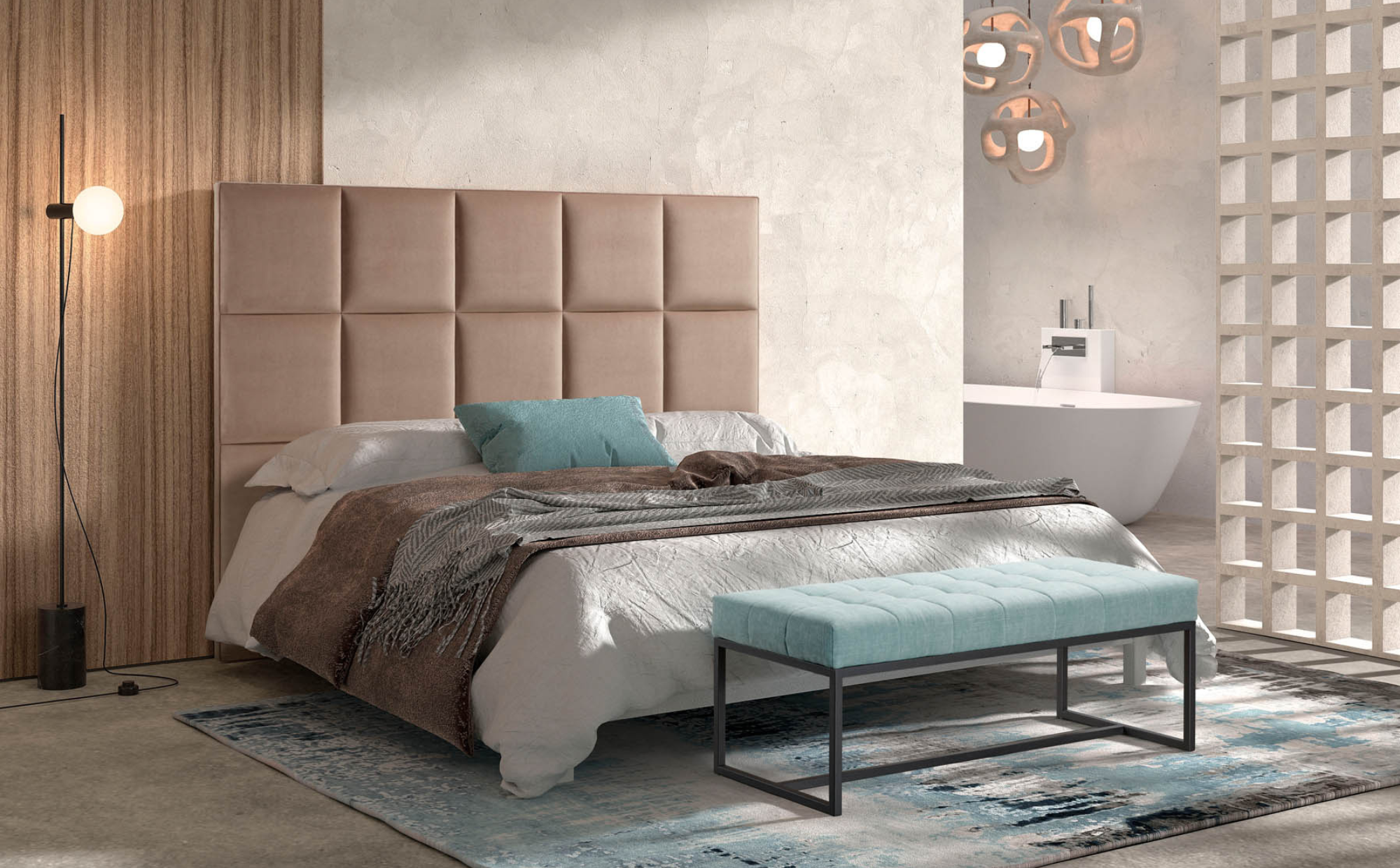 This Headboard is crafted by a combination of wooden square design, constructed from dark brown fabric-covere