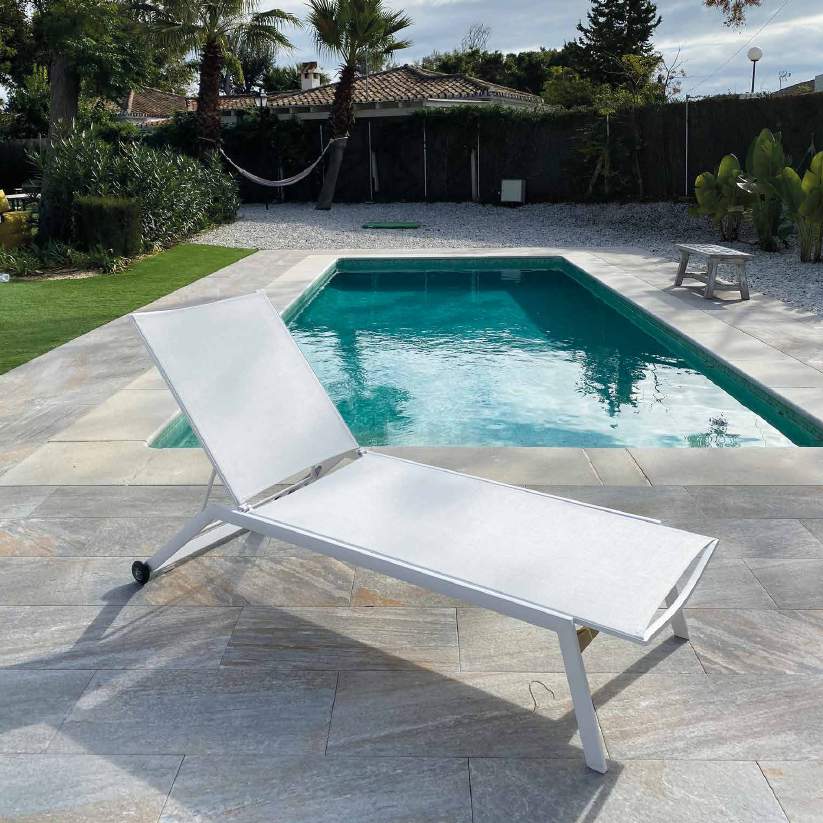Stackable sunbed with wheels.It has rear wheels