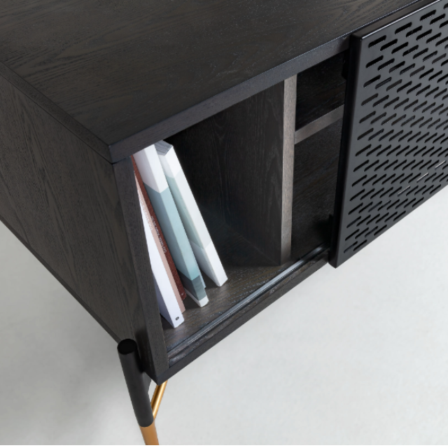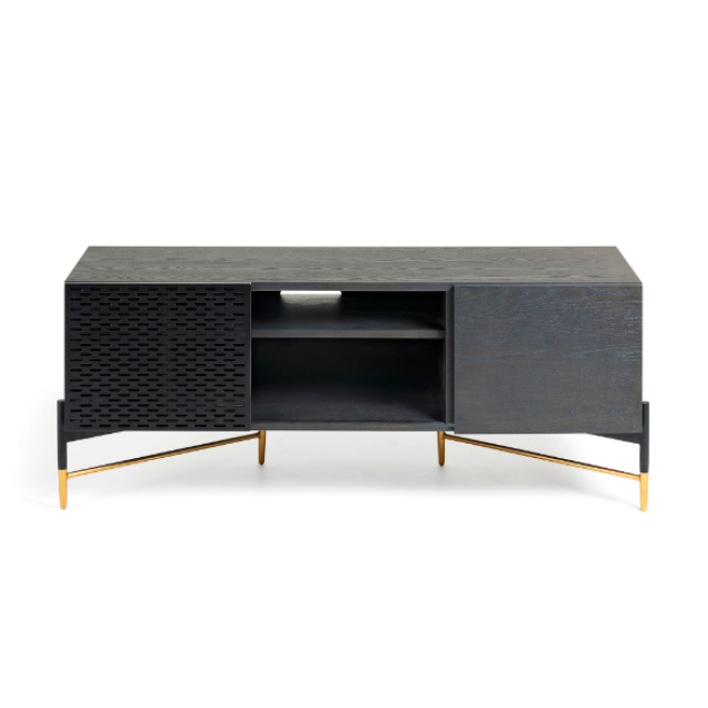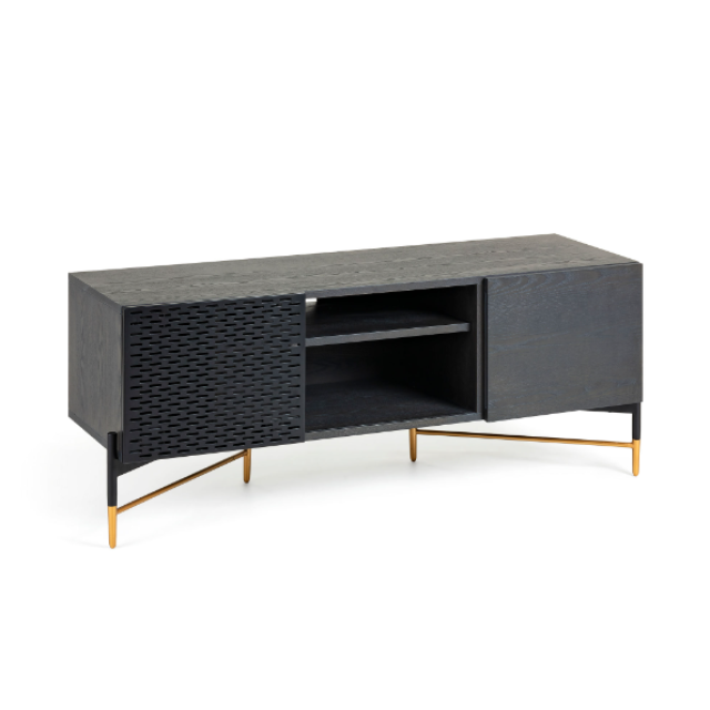 Milian TV unit with 2 doors in ash veneer and steel with black and gold finish 141 x...