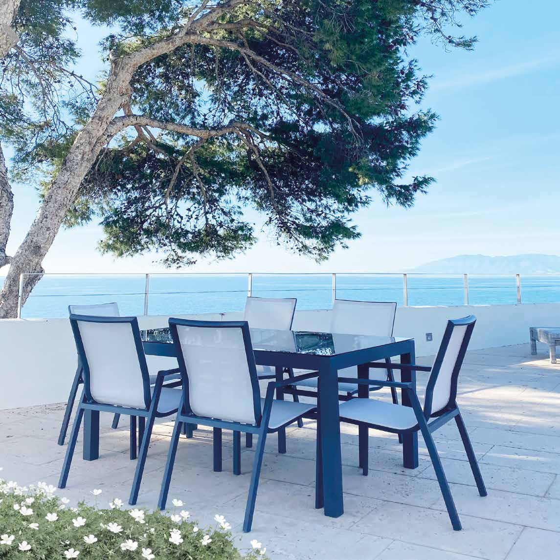 Oslo table: White or anthracite aluminum. Tempered glass in black and white.Nieves armchair: Stackable armchair. Anthracite or white...