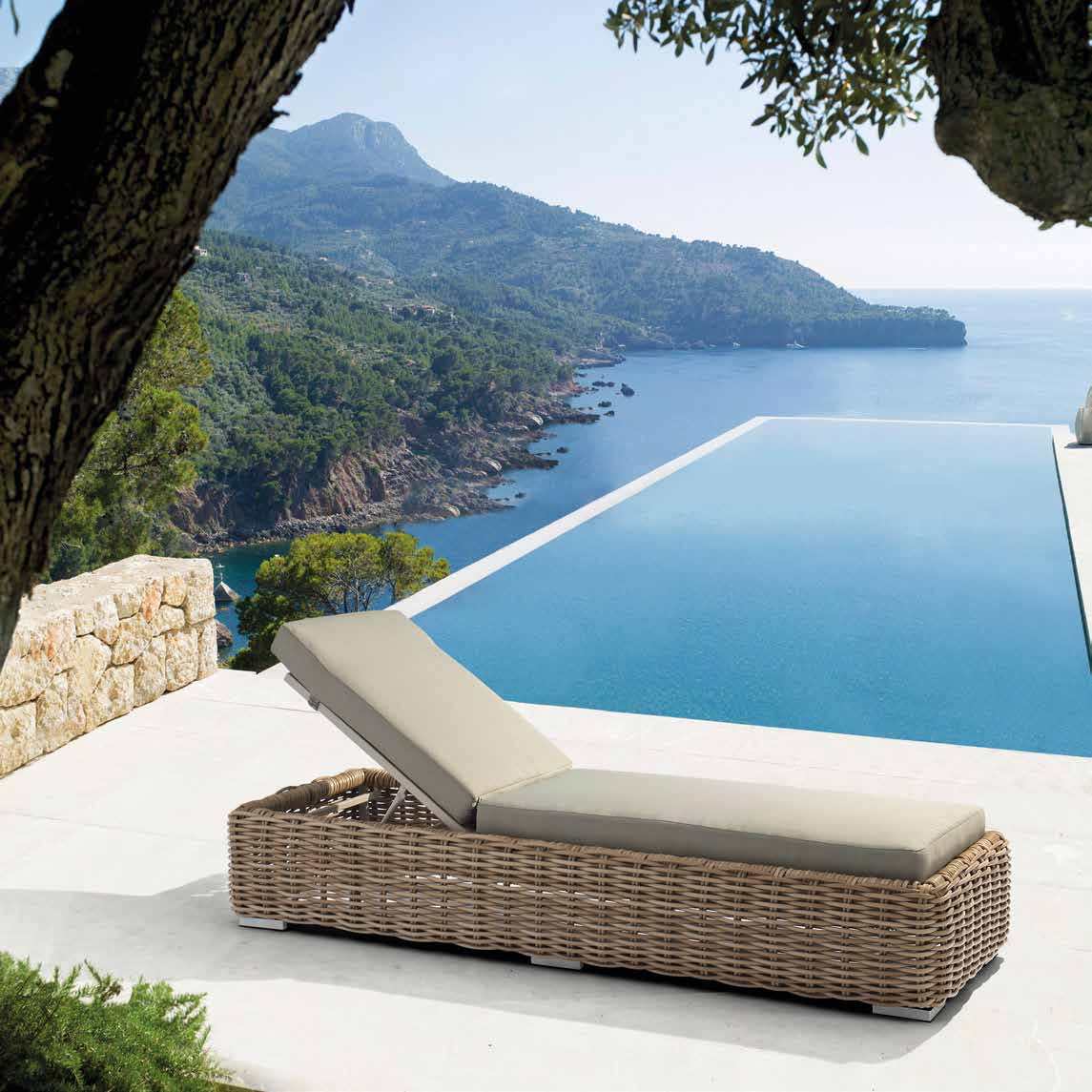 Aluminum sunbed, Brown synthetic fiber, Taupe polyester cushion.