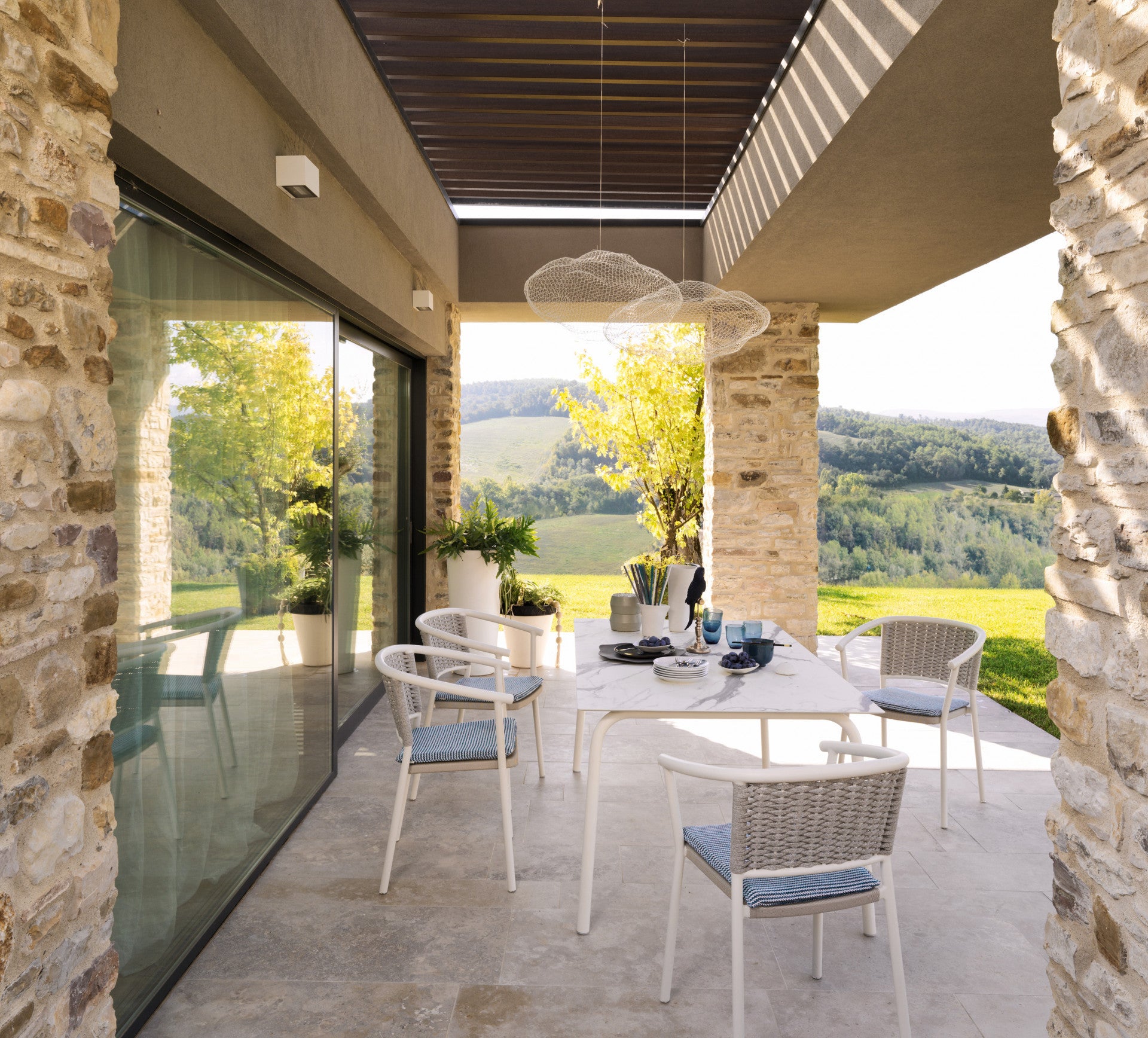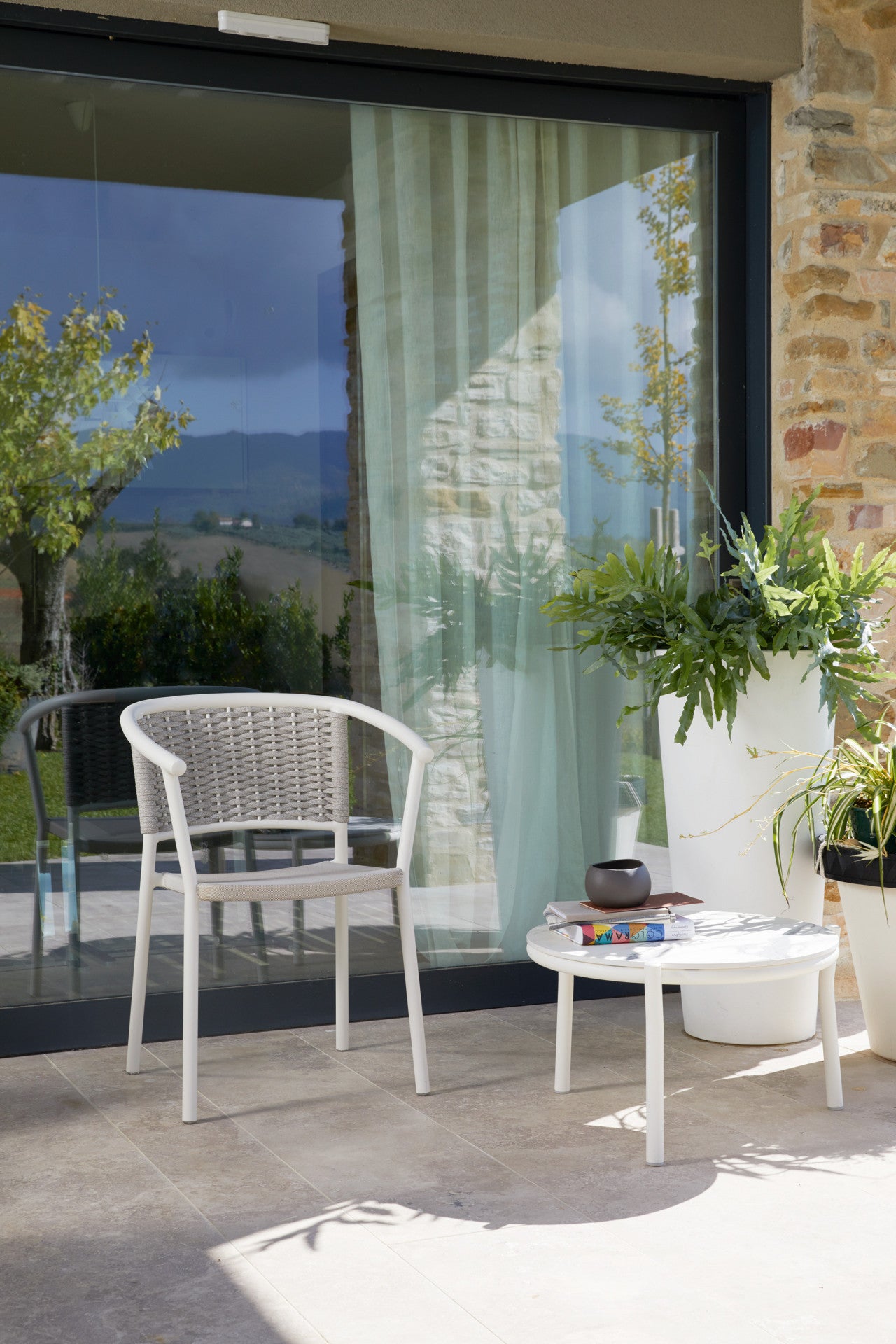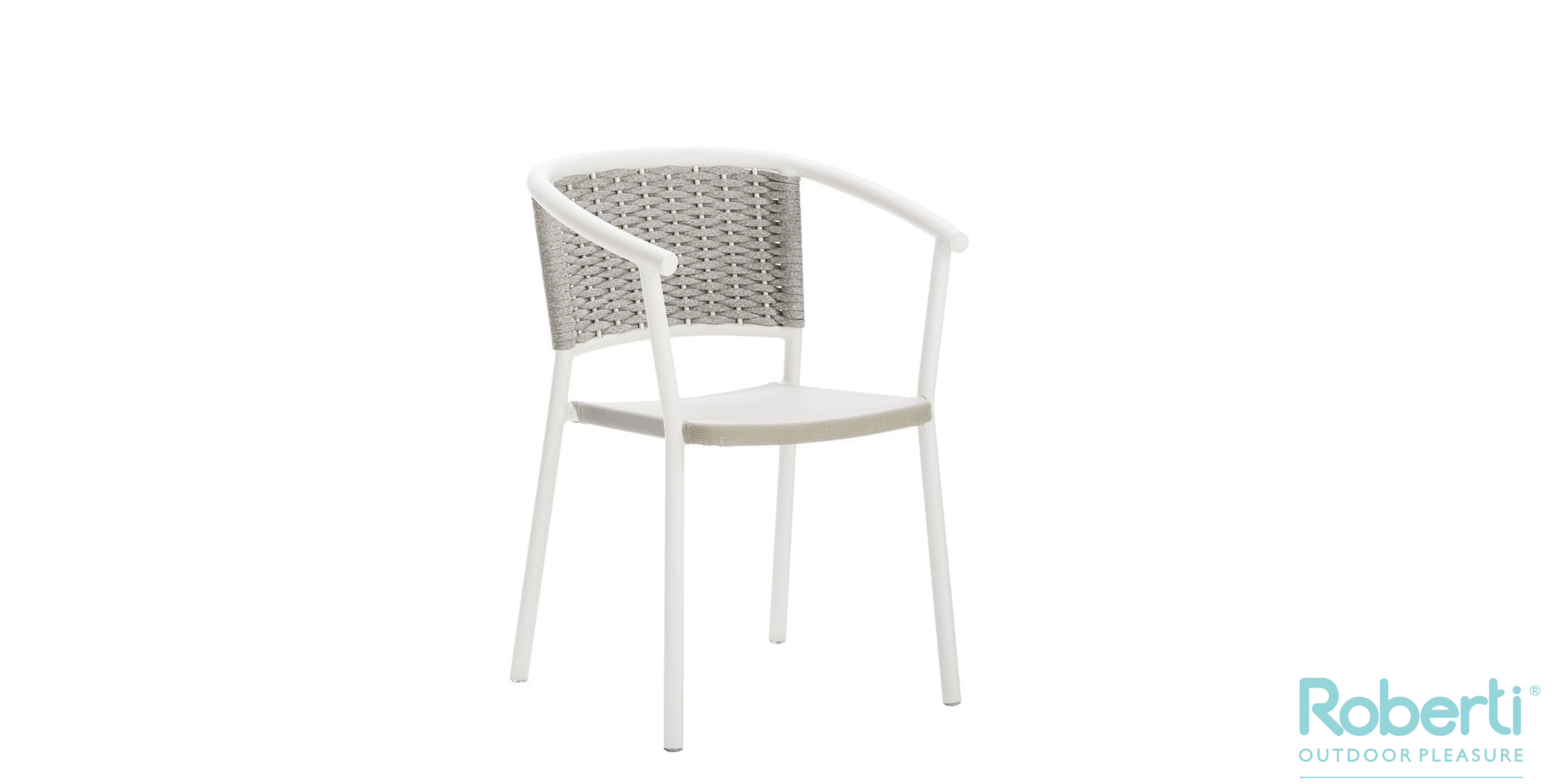 Chair with armrests, aluminum powder coated, woven with Oval Searope.The design makes an elegant embrace, while the...