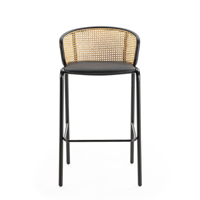 Stool rattan/metal/black/natural leather