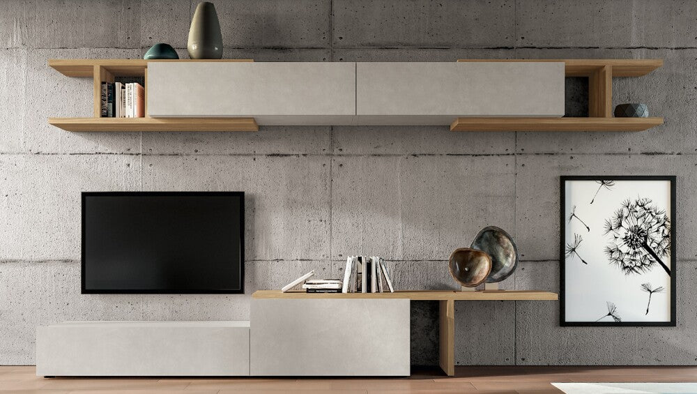 Minimalist lines decorated with unusually cut shelves create a modern living area with a zen-vibe design.