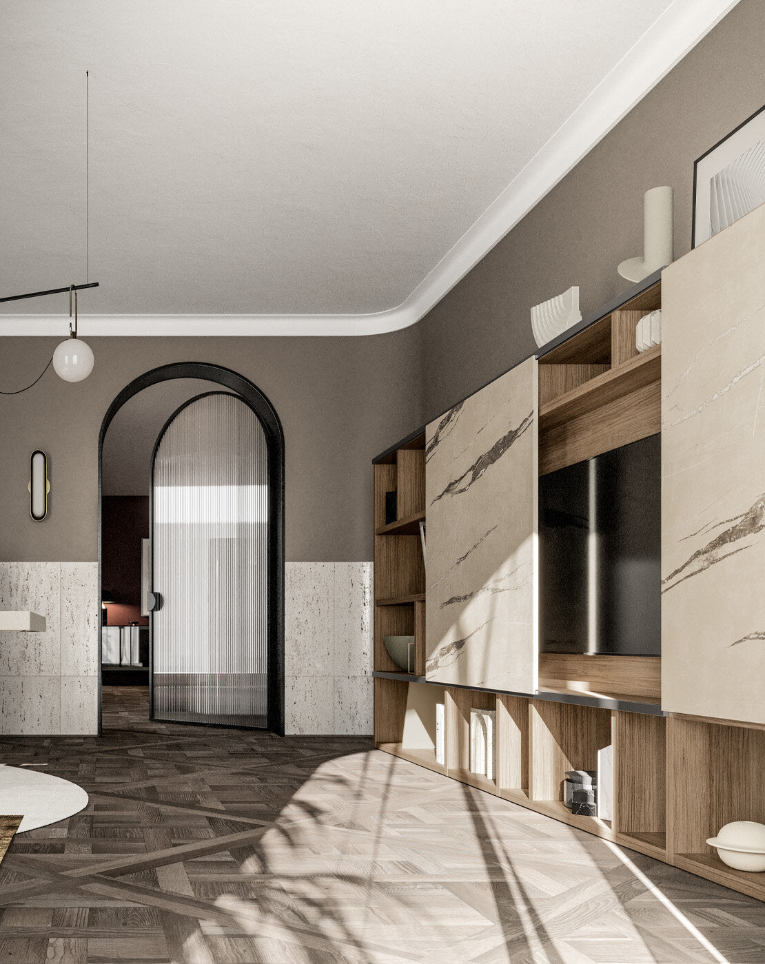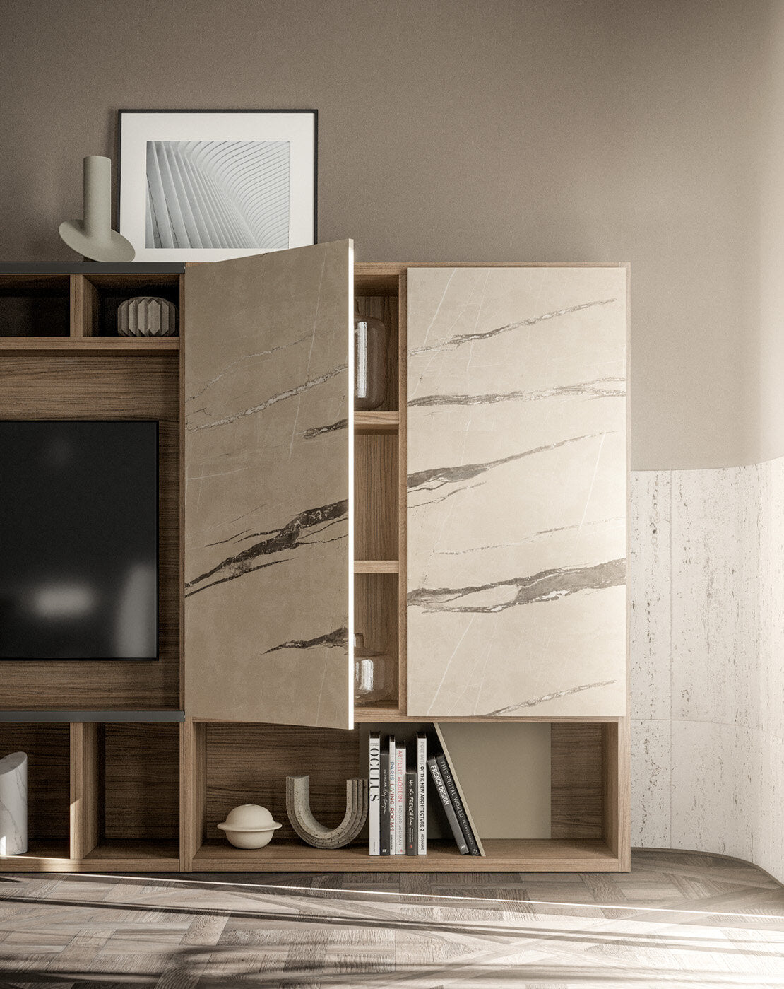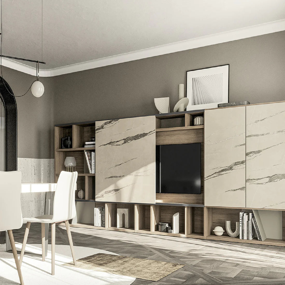 The bookcase extends along the entire length of the wall, alternating open compartments with vertical and oblique...
