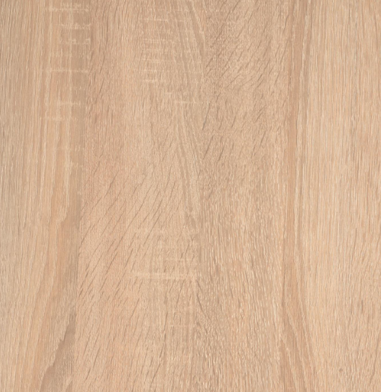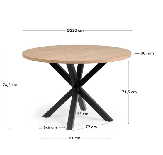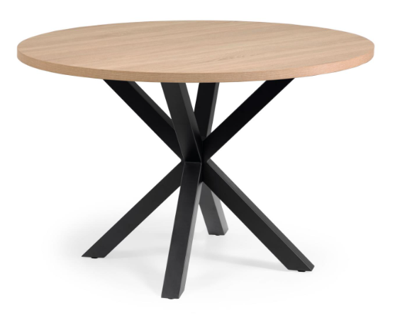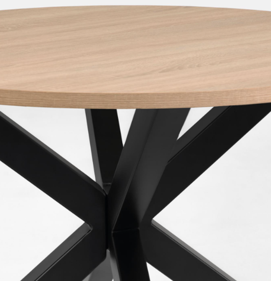 Full Argo round melamine table with natural finish, black finish steel legs