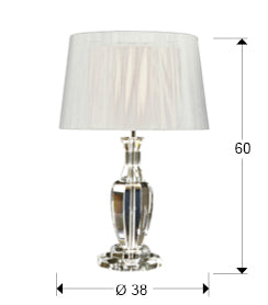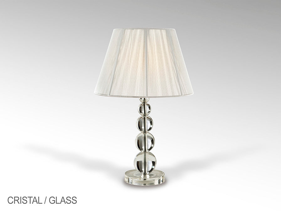 Table lamp made of transparent glass and chromed metal. Double screen: Interior with opal vinyl and fabric....