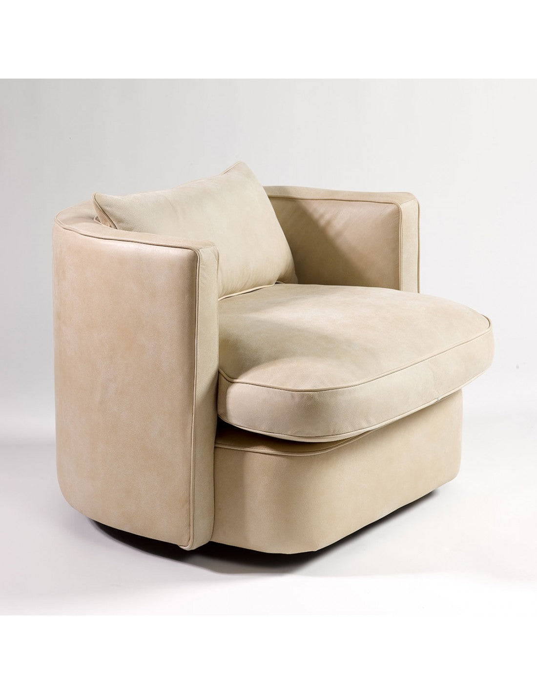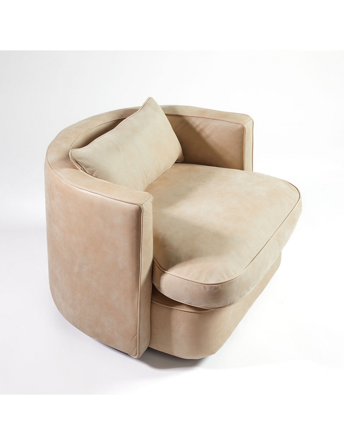 Off-white, leather armchair w/ semicircular backrest, black metal structure, soft cushions upholstered in leather. Elegant and stylish,...