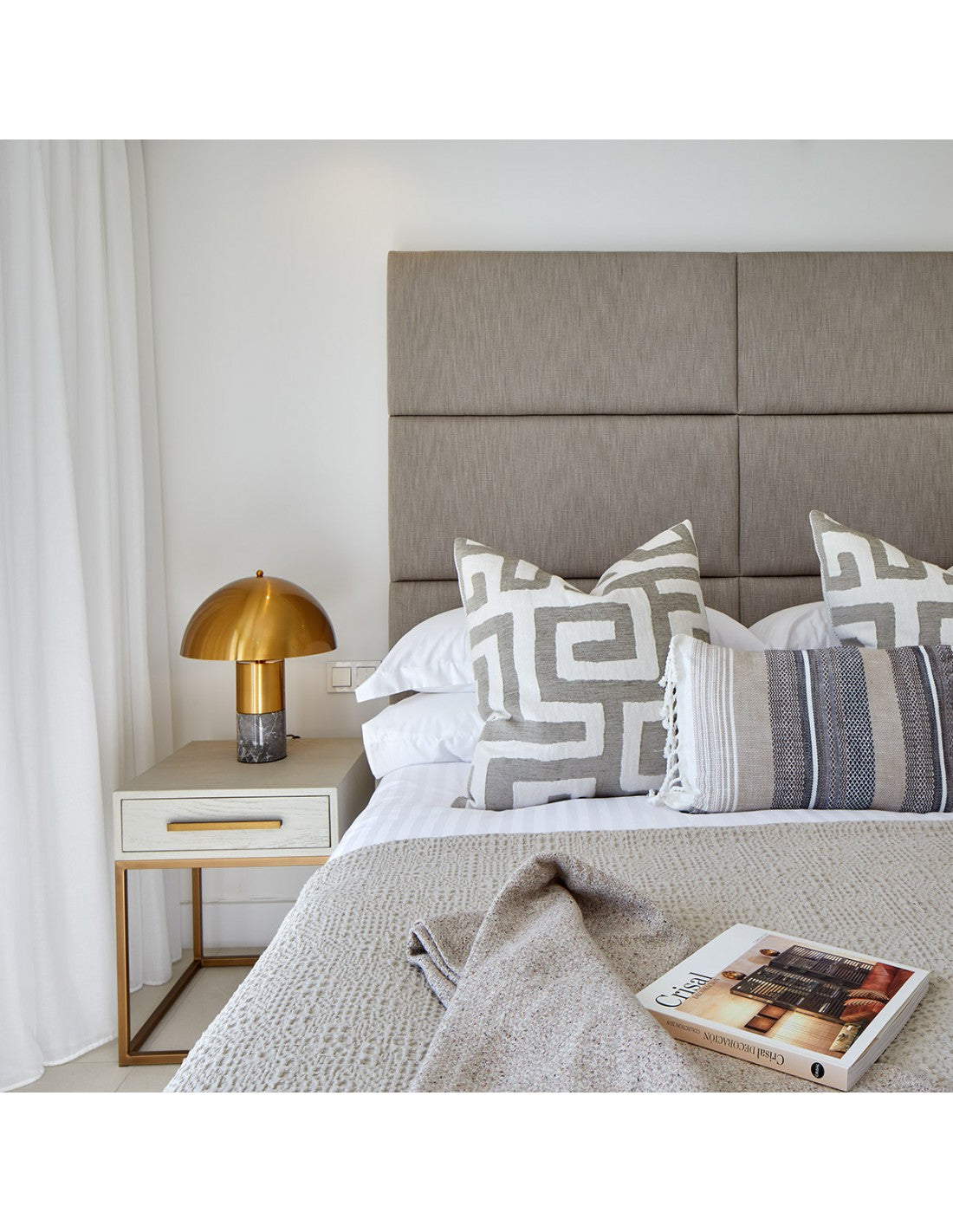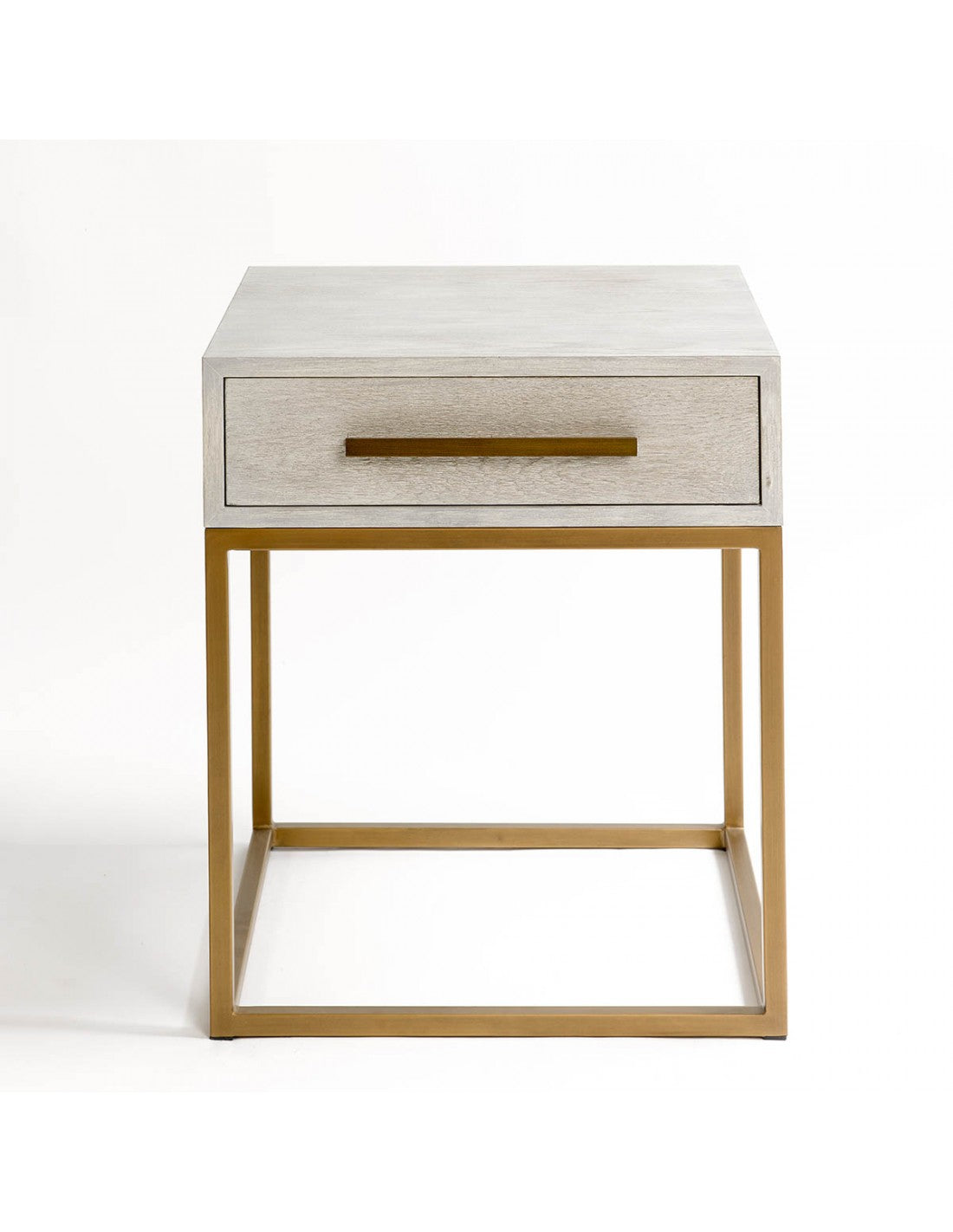 Patina white oak bedside table with aged gold metallic structure. Bedside table with drawer. Piece with straight...