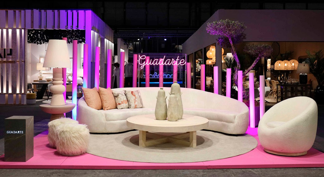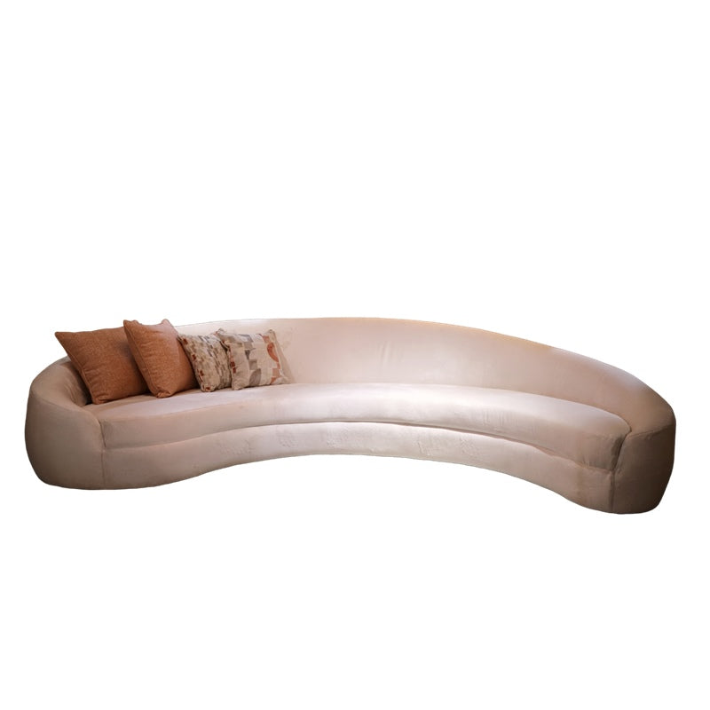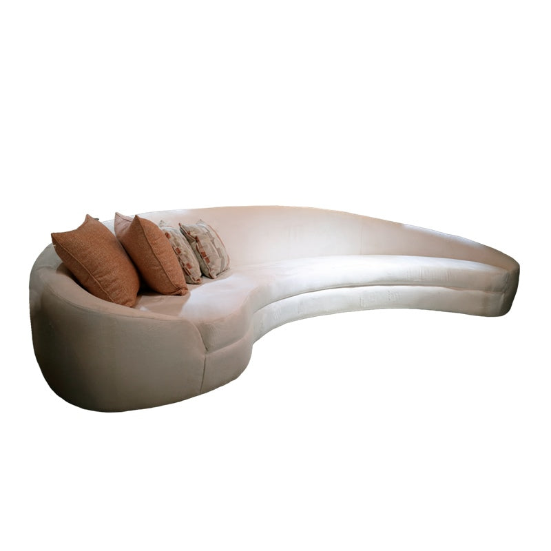 This sofa features a distinctive curved shape and is upholstered in a pristine white fabric. Its generous...
