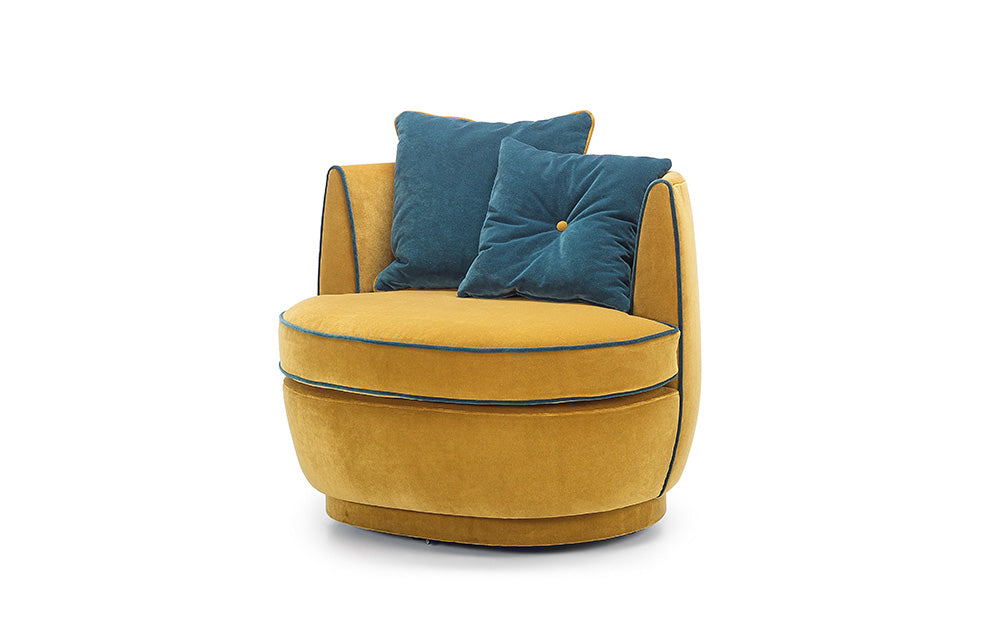 Sturdy wooden armchair with a round silhouette for living room spaces.