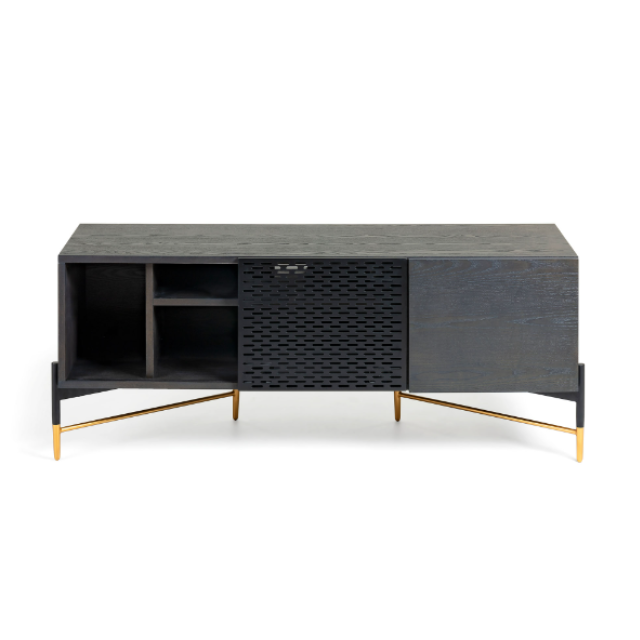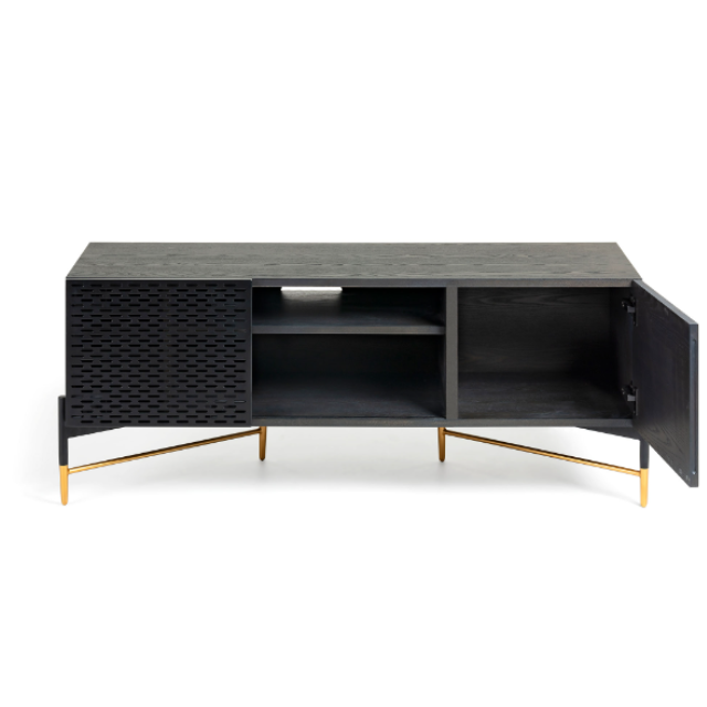Milian TV unit with 2 doors in ash veneer and steel with black and gold finish 141 x...
