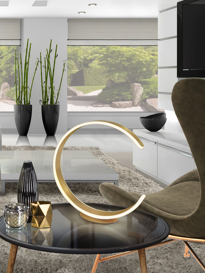 Table lamp made of brushed aluminum and steel, matte gold finish. Opal silicone diffuser. 19.2W LED lighting....