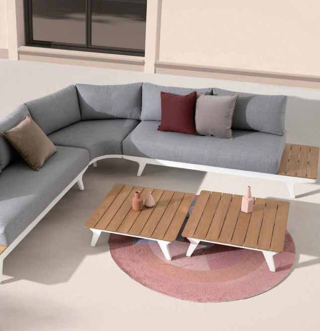 White aluminum, completion of two side tables with teak top.Set of 2 aluminum coffee tables in white...