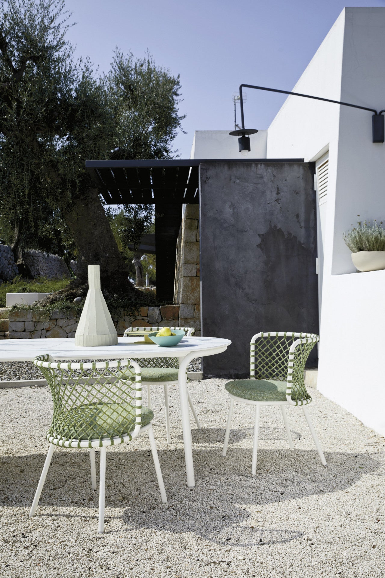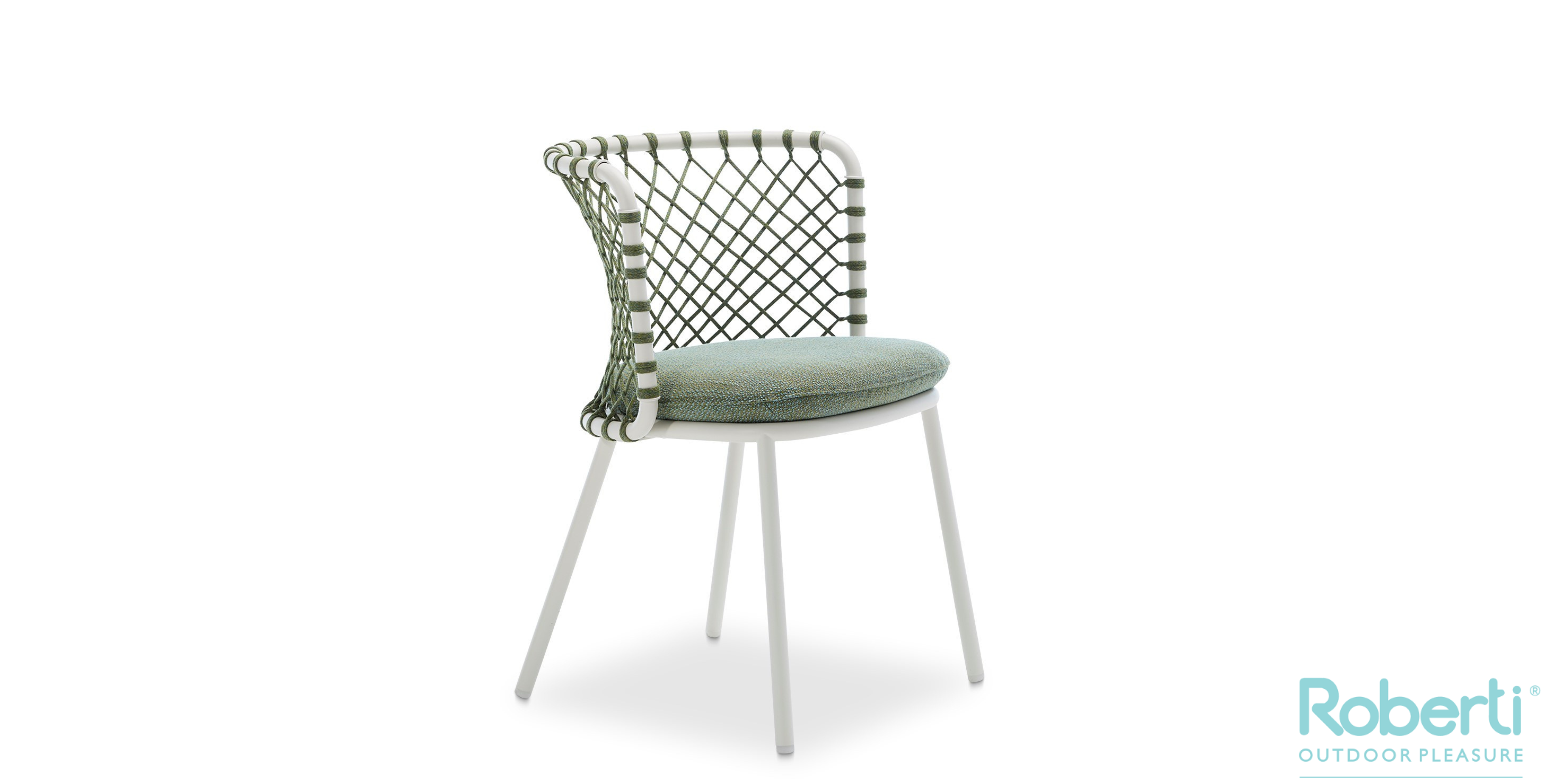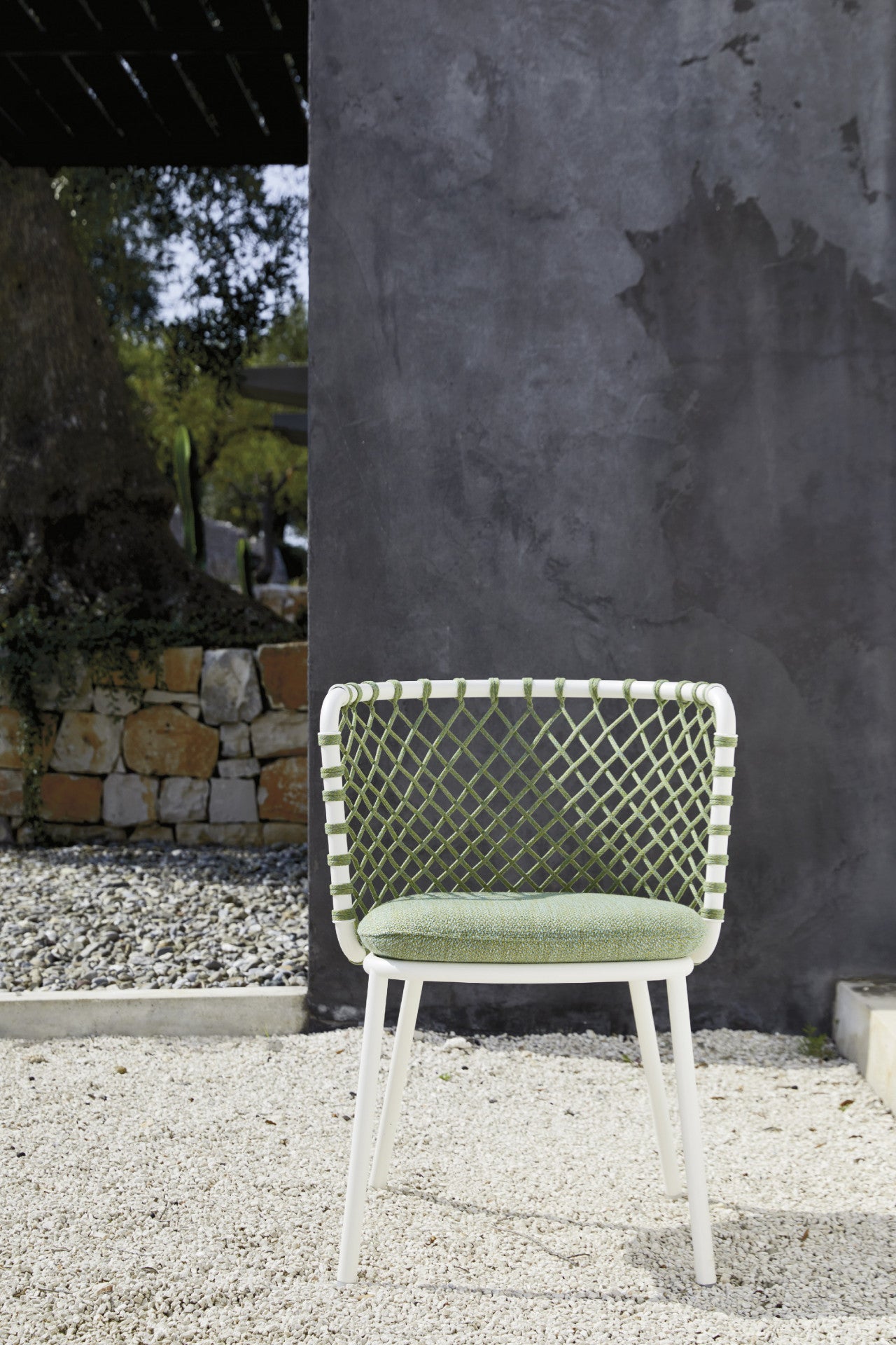 Chair in powder coated 304 steel, woven with Flat Trendyrope. Elegant design and enveloping comfort, thanks to...
