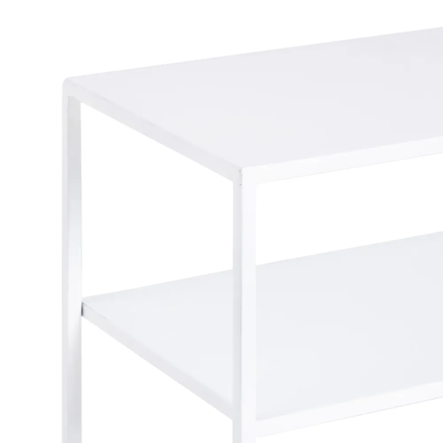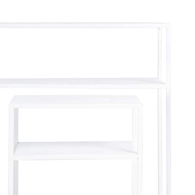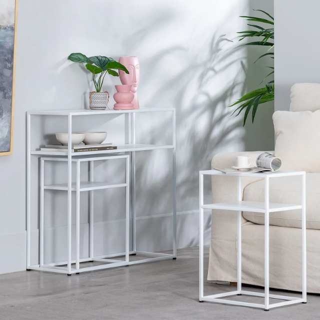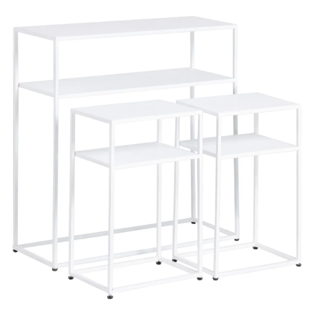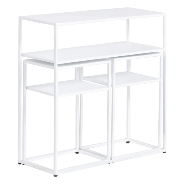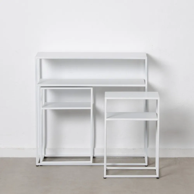 Set of 3 Console and 2 white metal tables.  Material: iron Console size: 80x30x80cm. Table size: 37.5x26.5x57cm.
