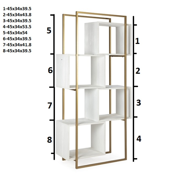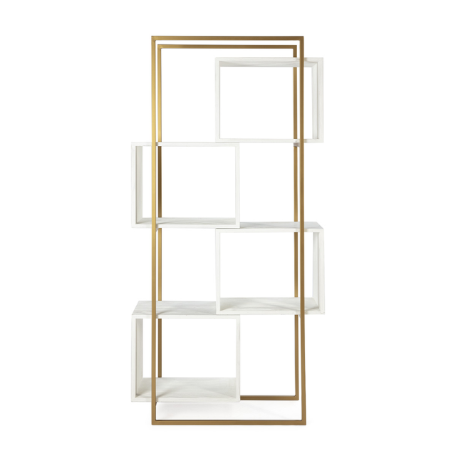 Shelving white wood/gold metal.
