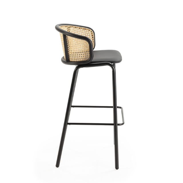 Stool rattan/metal/black/natural leather