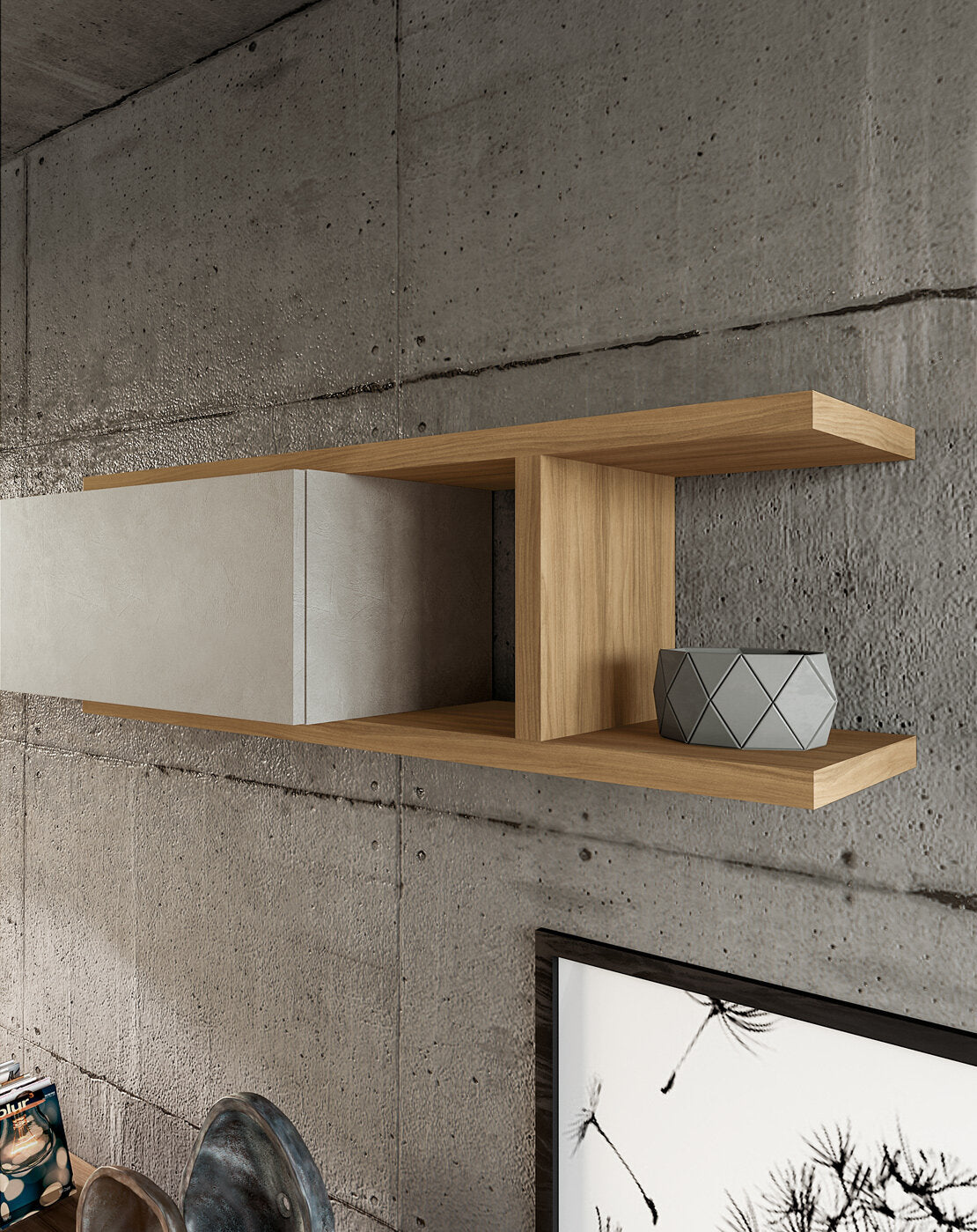 Minimalist lines decorated with unusually cut shelves create a modern living area with a zen-vibe design.
