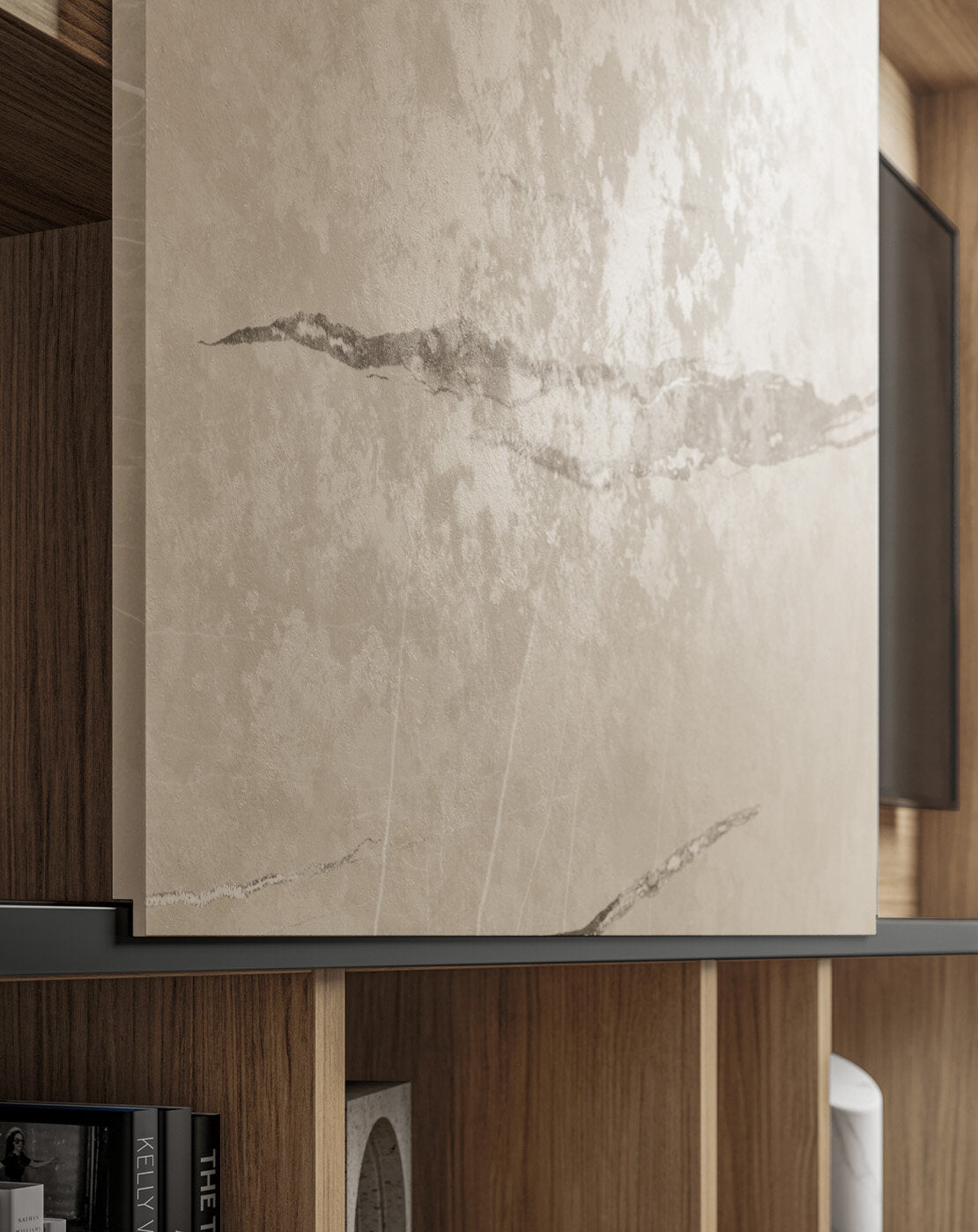 The bookcase extends along the entire length of the wall, alternating open compartments with vertical and oblique...