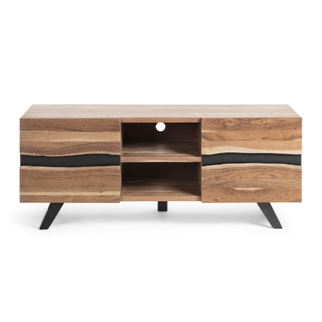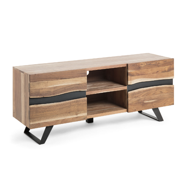 Uxia TV cabinet 2 doors in solid acacia wood and black finished steel 160 x 65 cm